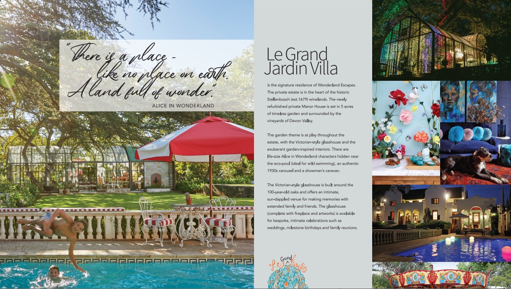 Le Grand Jardin Villa is the signature residence of Wonderland Escapes. The private Estate is in the heart of the historic Stellenbosch Winelands. The newly refurbished private Manor House is set in 5 acres of timeless gardens, surrounded by the Vineyards of Devon Valley.