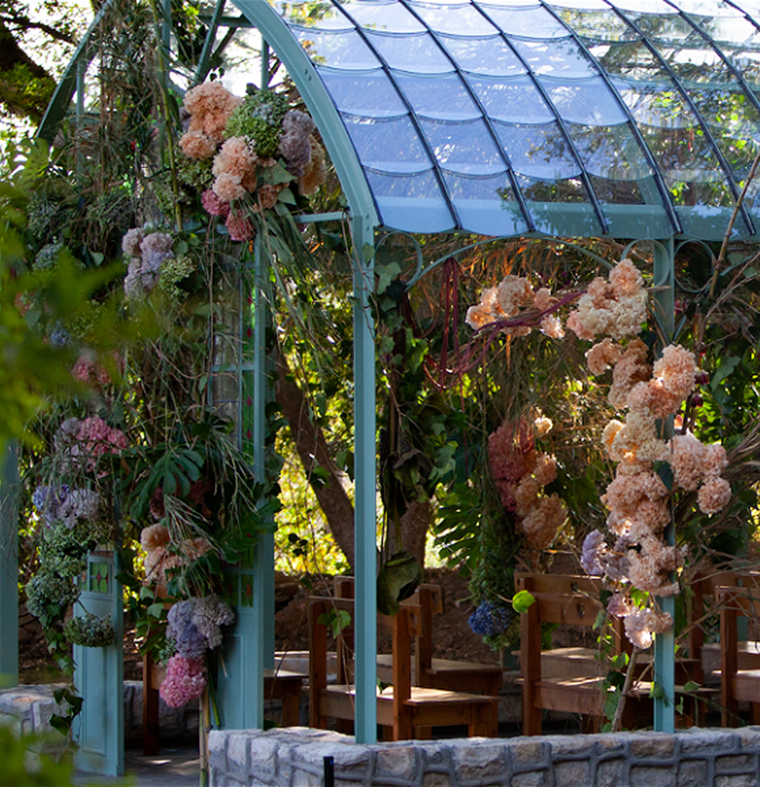 Private ceremonies can be held on the lawn between the glasshouse and pool, or vows exchanged in the Floral Chapel, with dappled light filtering through its pretty scalloped-glass roof. It seats 24 guests on wooden benches with ease.