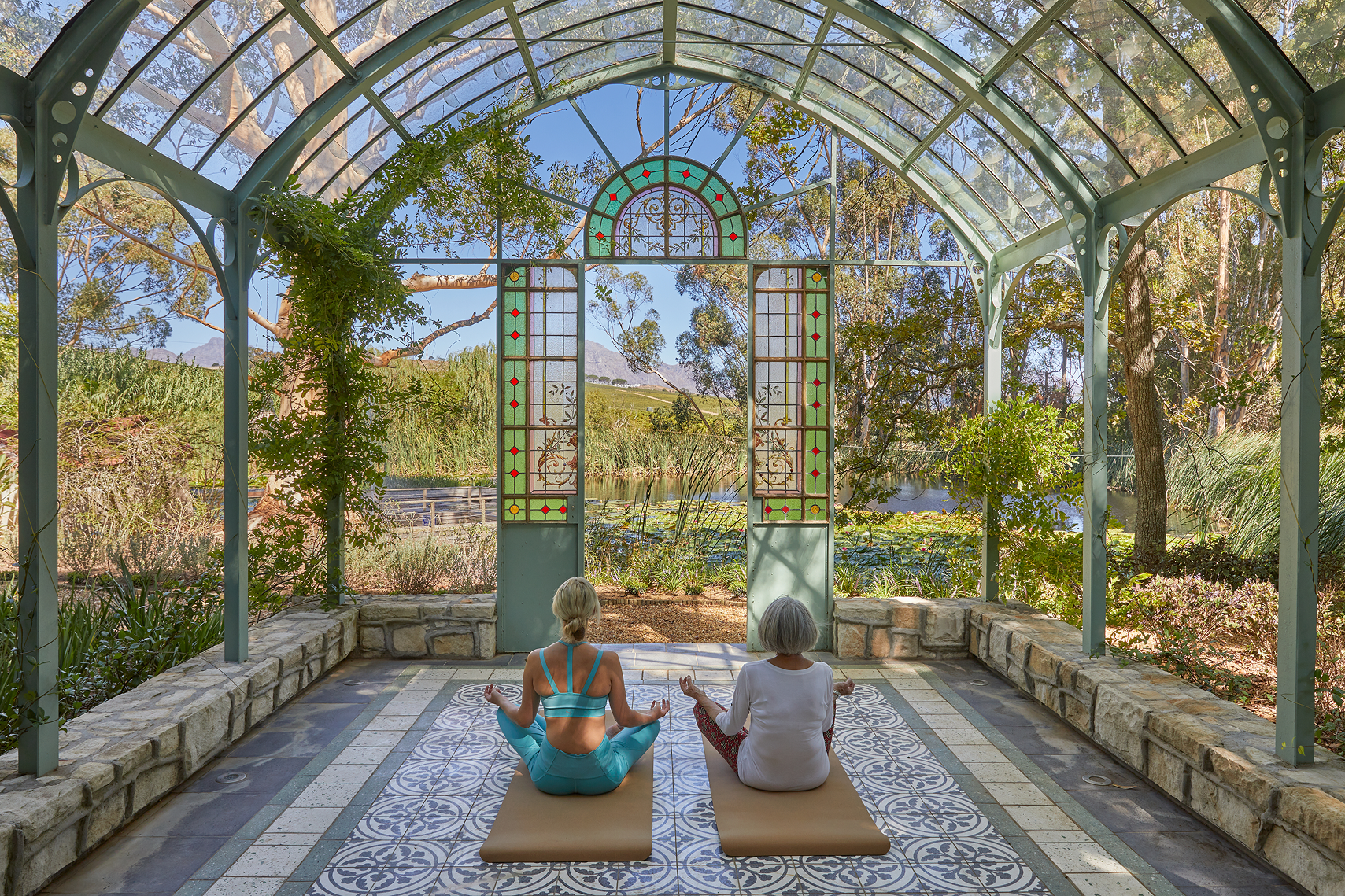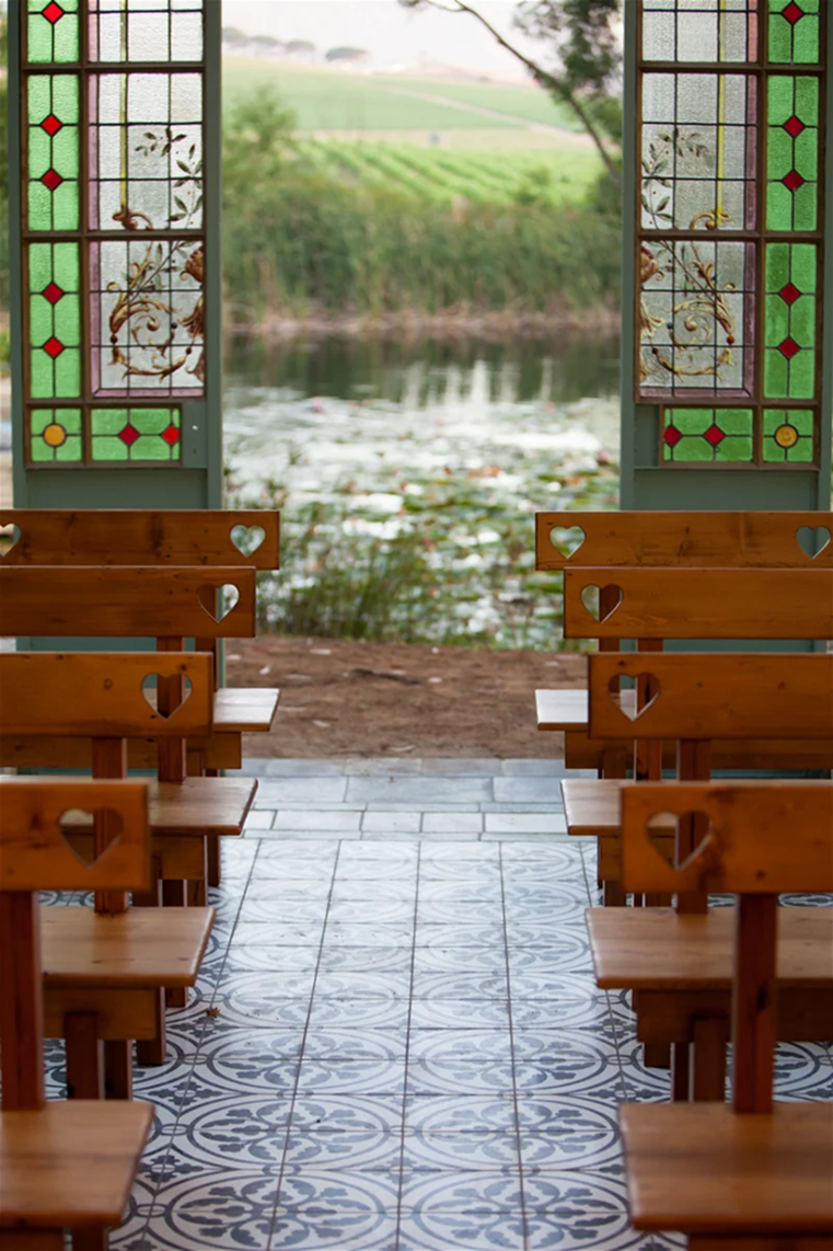 Set a scented flower garden with views through stained-glass doors across the water lilies to the Stellenbosch mountains beyond, it’s perfectly proportioned for private elopements.