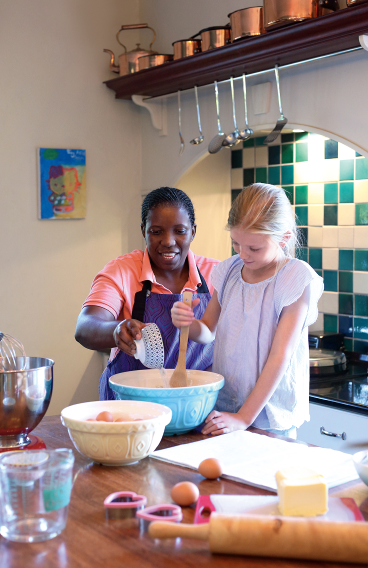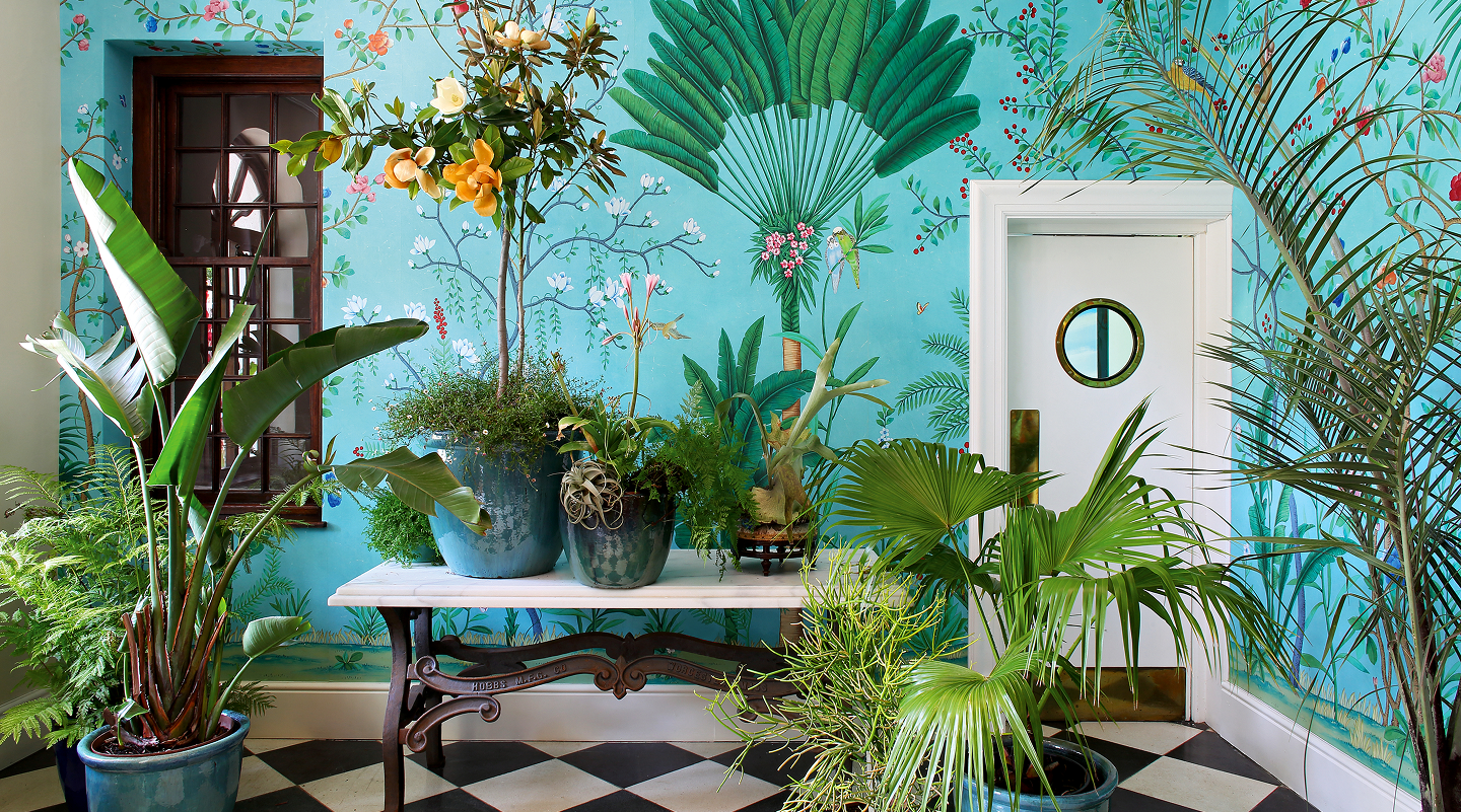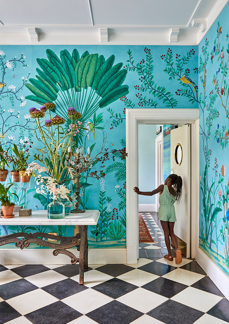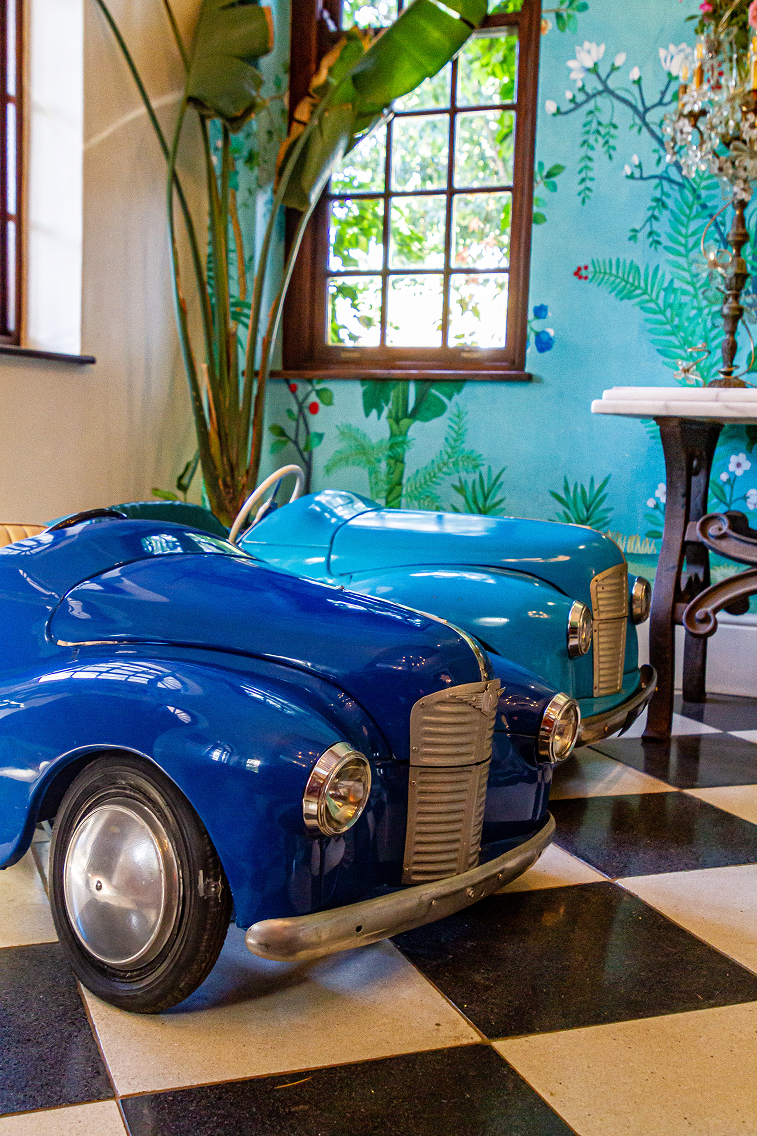 The sense of magical playfulness begins the moment you step into the double-volume entrance of the Manor House where de Gournay’s ‘Amazonia’ wallpaper provides a wildly exotic welcome. Lush palms and banana leaves, tropical birds, swinging monkeys and ornate butterflies dance across the walls in a riot of colour and charm. At the foot of the grand Burmese teak staircase, a pair of blue toy cars dating back to World War Two adds a nostalgic touch.